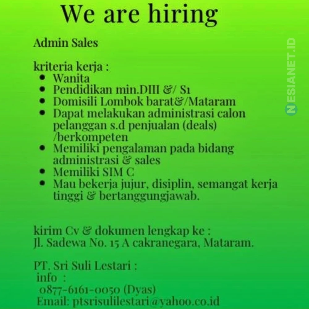 kirim Cv & dokumen lengkap ke: Jl. Sadewa No. 15 A cakranegara, Mataram.