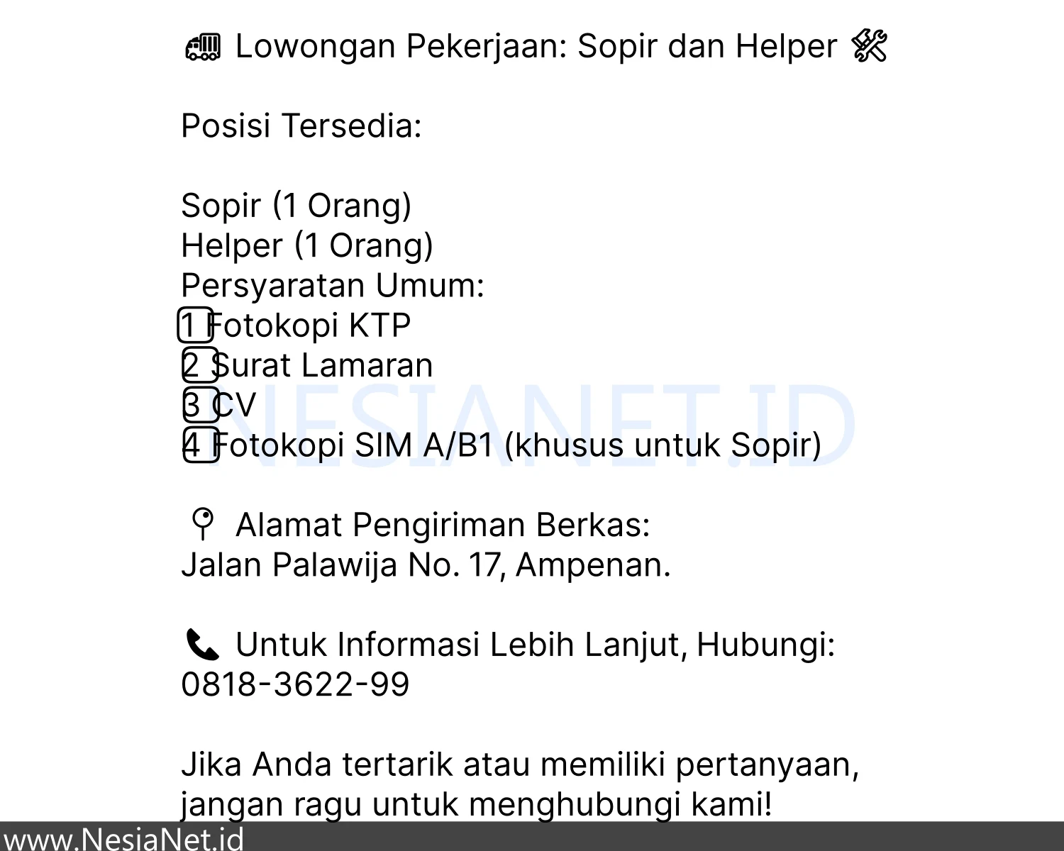 🚛 Lowongan Pekerjaan: Sopir dan Helper 🛠