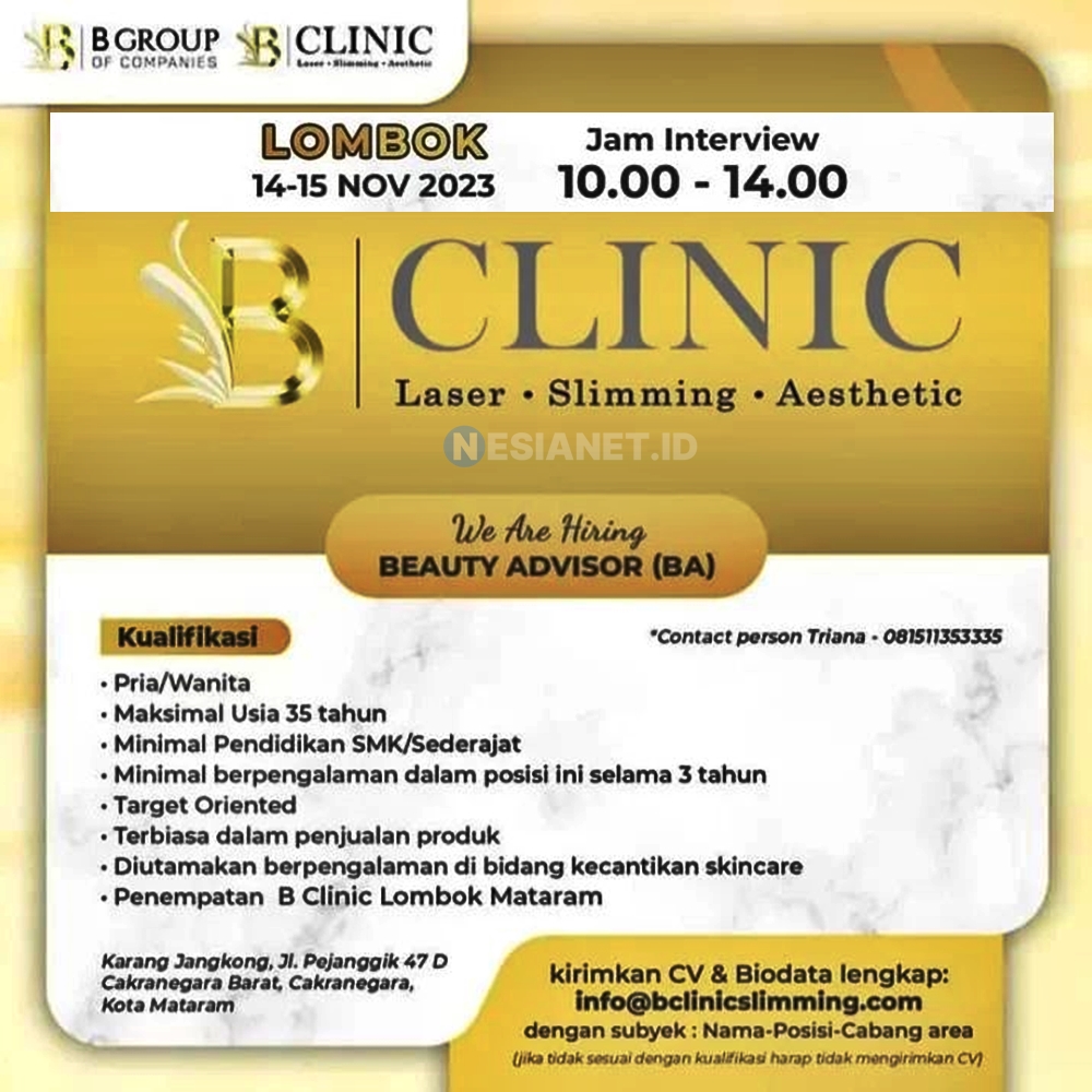 ✨ LOWONGAN KERJA: BEAUTY ADVISOR (BA) di B CLINIC LOMBOK ✨